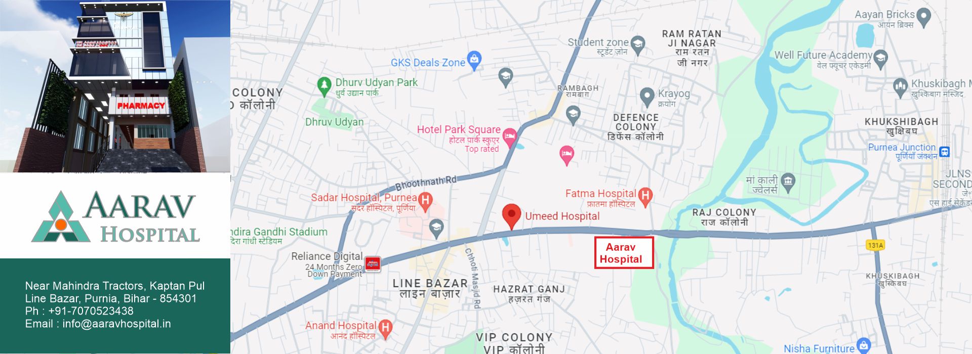 Aarav Hospital at Purnia is promoted by renowned Orthopedic Surgeon Dr Angad Kumar Choudhary and Gynecologist Dr Abha Prasad. The hospital is located near the Kaptan Pul in the Line Bazar Area of Purnia. The location of the hospital on NH-31 makes it easily accessible from Gulab Bagh, Araria, Katihar and Kishanganj. The hospital has 50 beds with 18 ICU Beds.